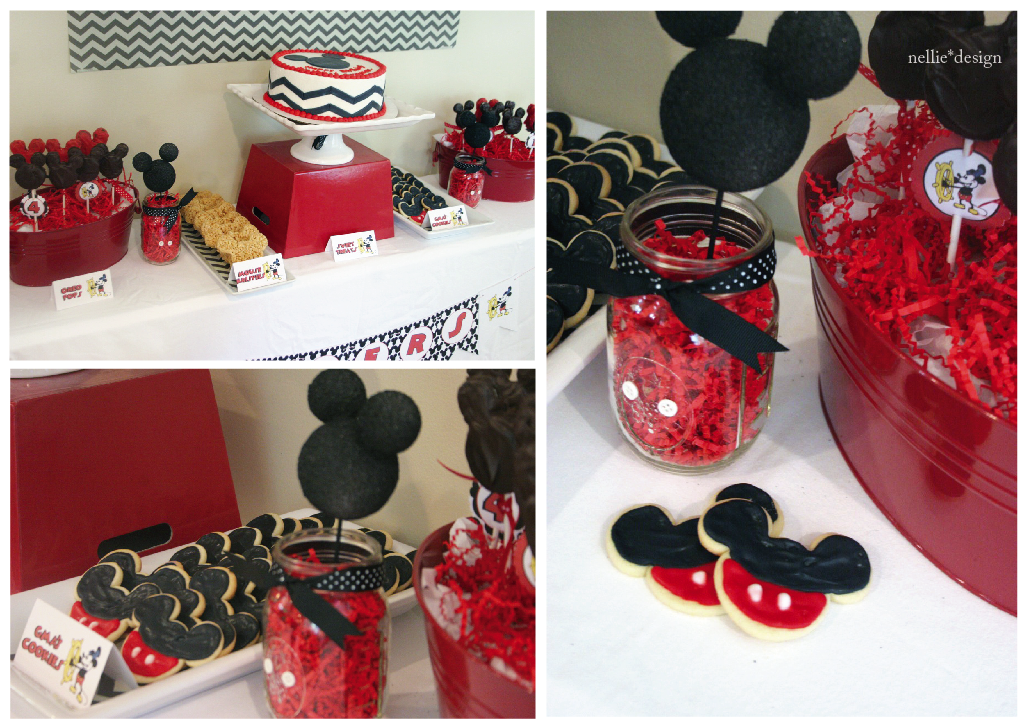 Our dessert table was filled with tasty treats, from mickey mouse cookies {lovingly made by my mom}, to mickey shaped rice krispie treats and oreo pops! A darling chevron cake made for a simple and modern center piece!